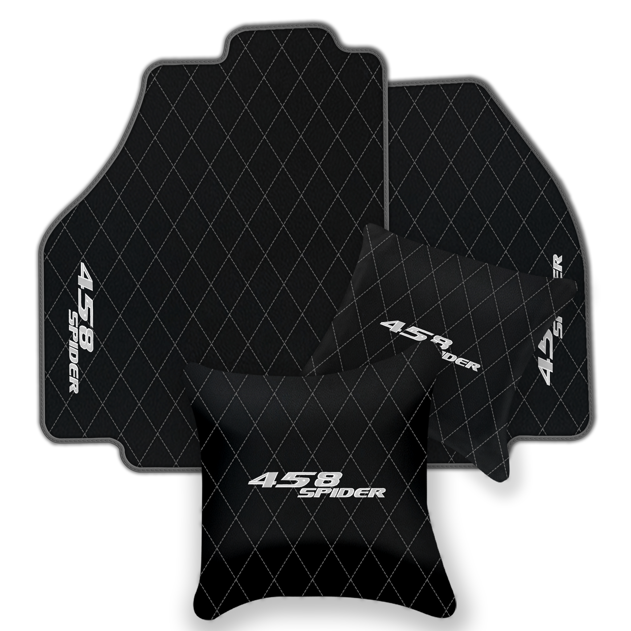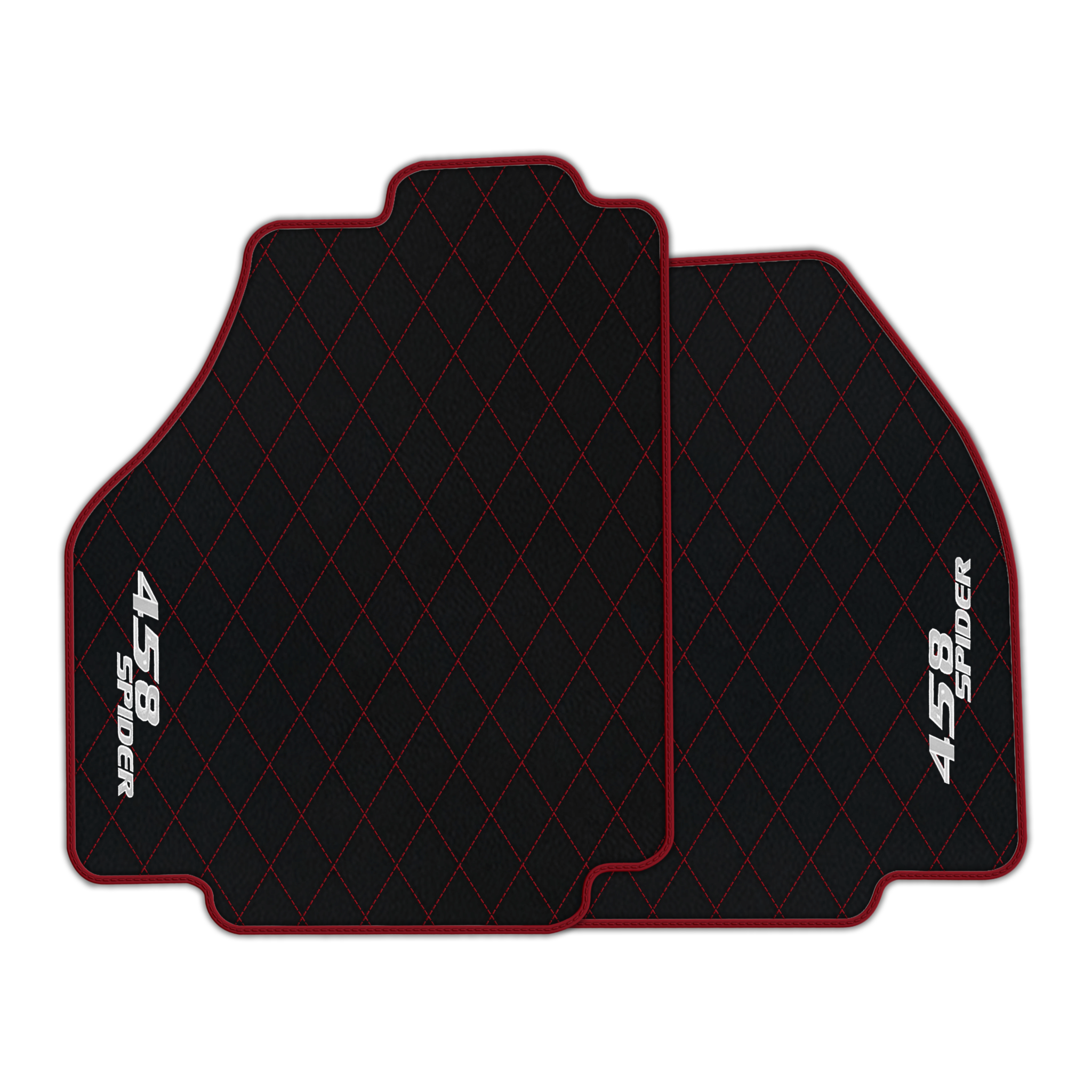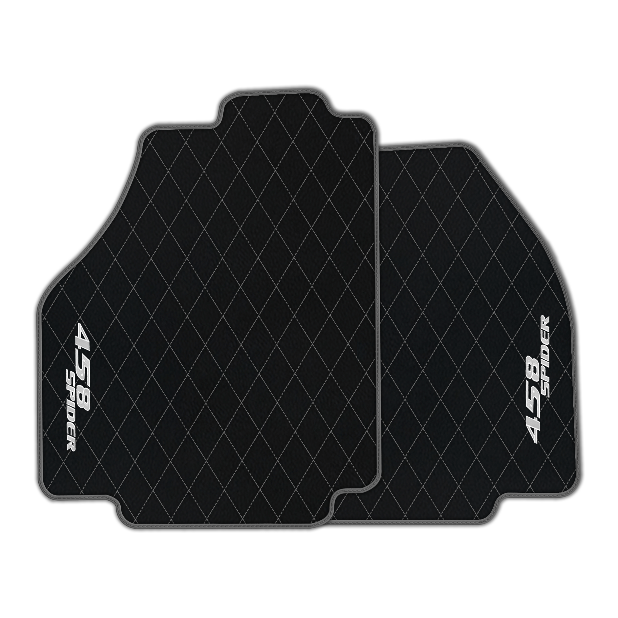 Upgrade your Ferrari 458 Spider interior with premium leather floor mats. Choose from multiple design patterns and custom stitching to match your style.