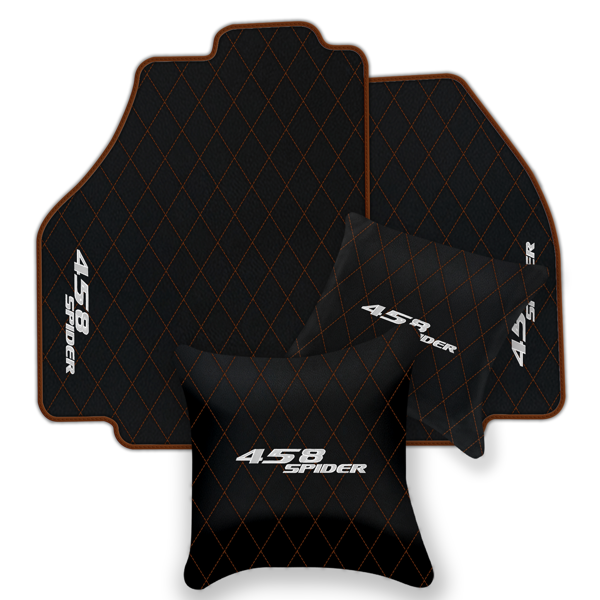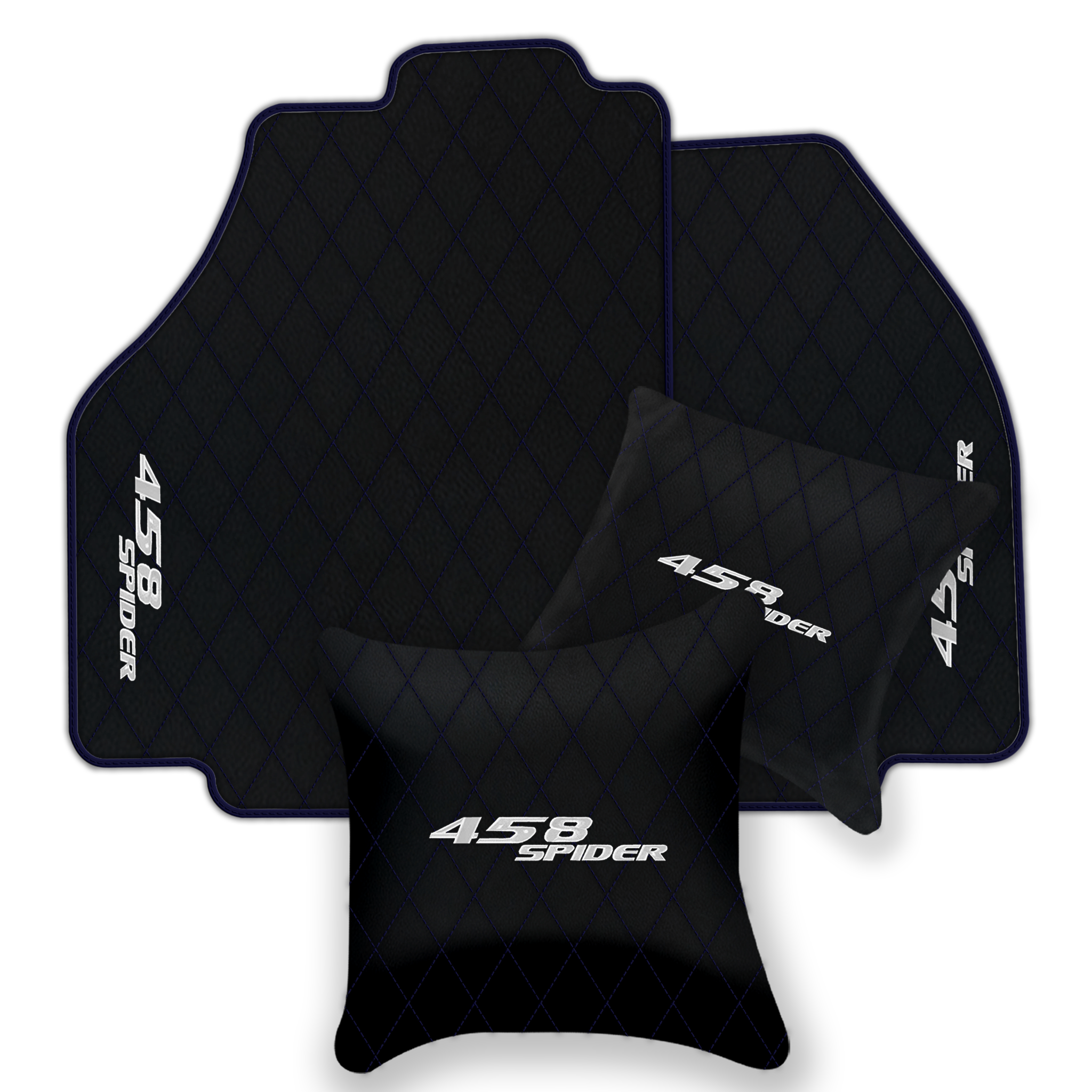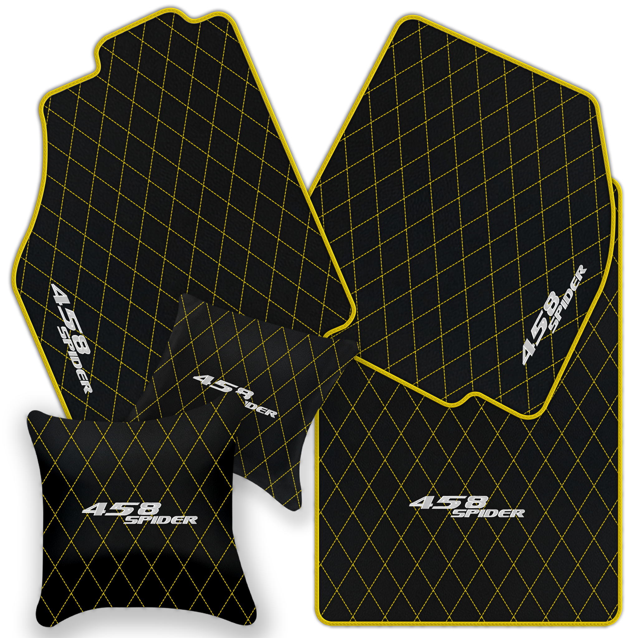 Upgrade your Ferrari 458 Spider interior with premium leather floor mats. Choose from multiple design patterns and custom stitching to match your style.